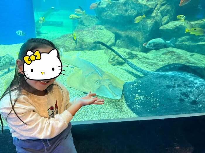 その写真を見てみると、大きな水槽で優雅に泳いでいる魚たちの前で口元をニコッとさせて楽しそうにしている次女の姿が!