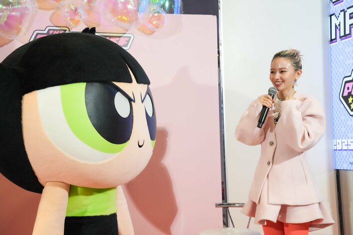 この日は、キャラクターのひとり「ブロッサム」の雰囲気を意識したという服装で登場。「どのキャラクターも好きです」と笑顔で語りました。