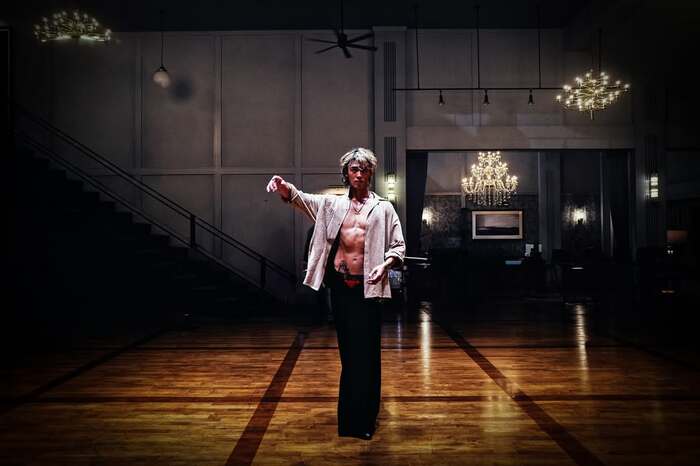 板張りのダンスホールに社交ダンスのシャドー練習のポーズをとりながら立ち尽くす竹内さん。