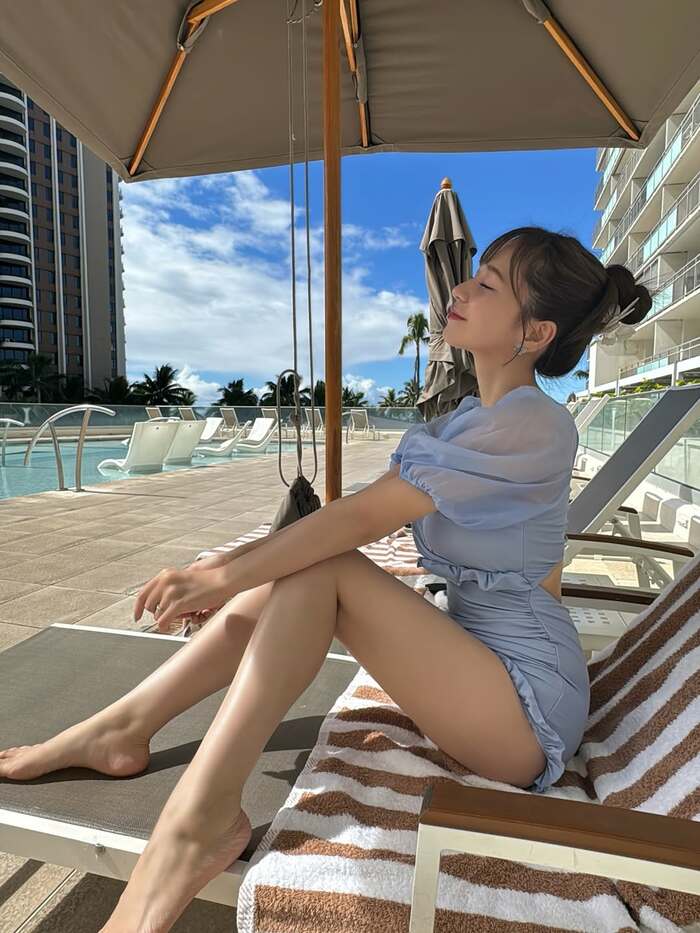 ハワイのプールサイドでくつろぐ、水着ショットを公開しました。