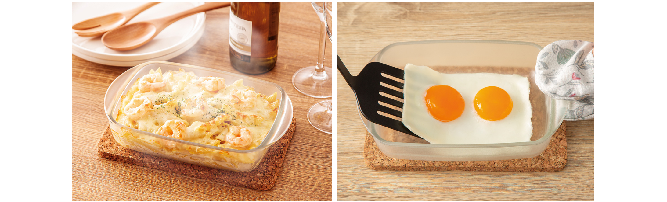 半透明なので、調理中の焼き加減や仕上がりを簡単に確認でき、そのまま食卓に出せるシンプルなガラスデザインです。