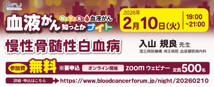 認定NPO法人キャンサーネットジャパン(東京都文京区 理事長 岩瀬哲)は、血液がんに関するオンラインセミナー「血液がん知っとかナイト」を開催しており、24回目の開催となる2026年2月は「慢性骨髄性白血病」をテーマに開催する運びとなりました。