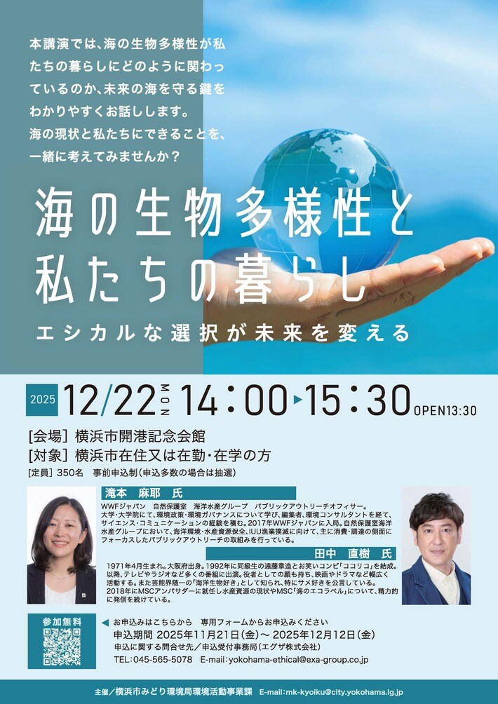 海の生物多様性が私たちの暮らしにどのように関わっているのか、人や地球環境、社会、地域に配慮した「エシカルな選択※1」が未来の海を守る鍵となることをテーマに講演会を実施します。当日は、講師に、専門家としてWWFジャパン※2の滝本氏と、海洋生物を愛するタレント・ココリコ田中氏をお迎えします。