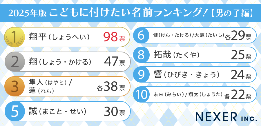 2025年版男の子に付けたい名前ランキングでは、「翔平」が98票で断トツの1位となり、2位の「翔」と合わせて大谷翔平選手からの影響が極めて大きいことが示されました。
