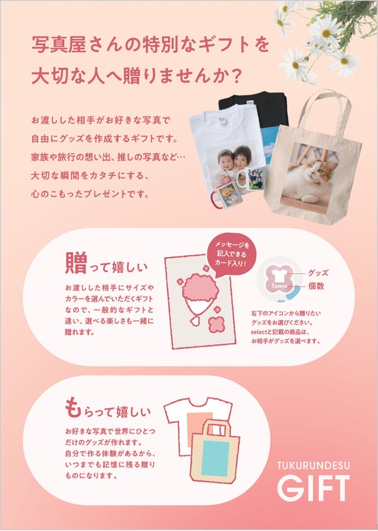 本サービスは、ギフト選びの負担を軽減し、受け取った相手が自分の好みで Tシャツ・トートバッグ・マグカップを作れる “ギフト券型”の仕組み を採用しています。
