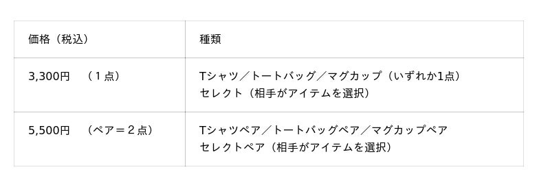 セレクト形式で相手がアイテムを選べる、Tシャツ/トートバッグ/マグカップの3カテゴリ選べる3アイテム×1点 or ペア(2点)