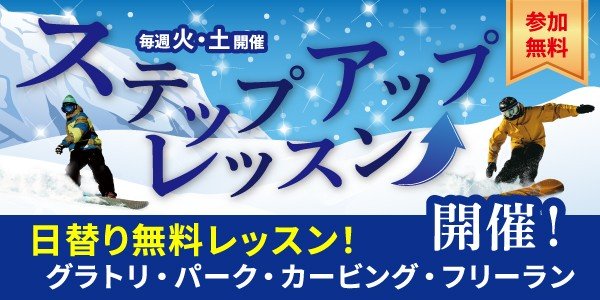 今シーズンから、初級者~中級者向けの「ステップアップレッスン」を日替りで開催いたします。毎回異なったレッスン内容となり、カービングやグラトリ、パーク、フリーランなど幅広い内容を、無料(※1)でレッスンいたします。カービングは「ラマ先生」率いる「R-LABO」、グラトリやパークは「高橋レオ」率いる「グラトリ&パークスクール竜王校」、フリーランは「橋本通代」率いる「LION SNOWBOARD SCHOOL」がレッスンを実施いたします。