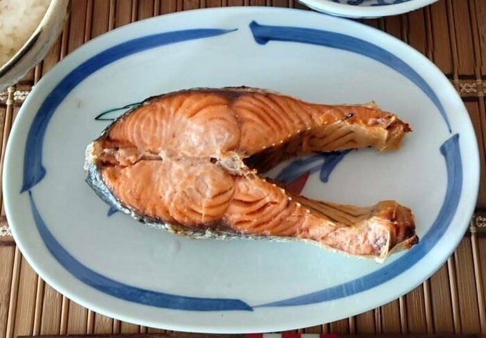 オレンジがかった色の身と銀色の皮が鮮やかに映えた焼きサケは、たっぷり脂がのっているようで、とってもおいしそうです。