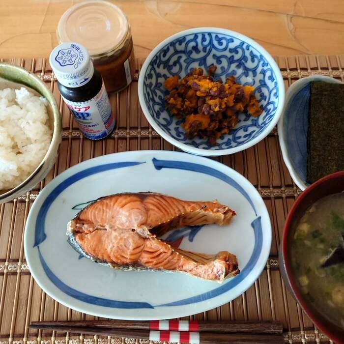 そして、「焼いていただきました」とつづった秋野さんは、サケを使った和朝食を披露。