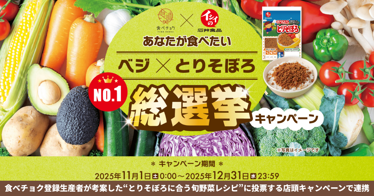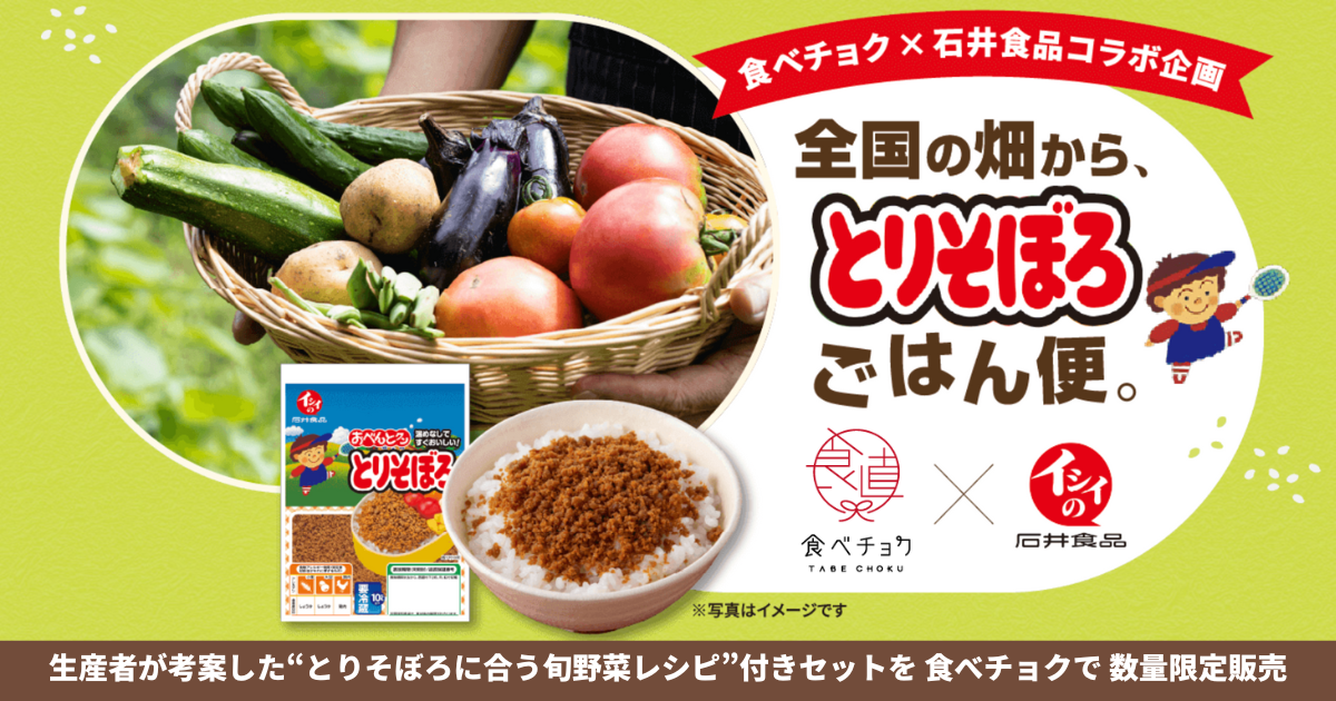 石井食品のロングセラー商品「とりそぼろ」に対して、食べチョク登録生産者が“うちの野菜に一番合う”食べ方を提案。レシピ総選挙キャンペーンも同時スタート。