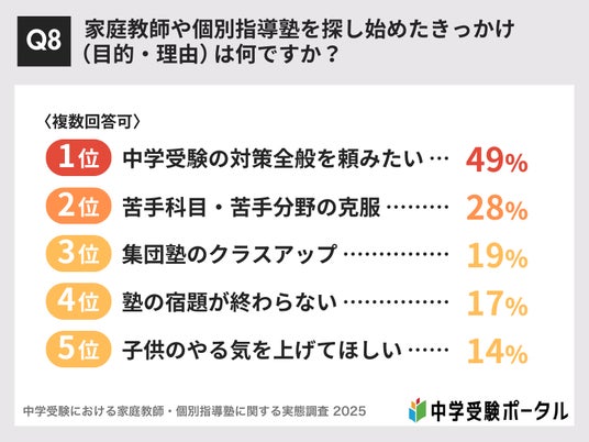 家庭教師や個別指導塾を探し始めたきっかけを問う質問では、「中学受験の対策全般を頼みたい」が49%で断トツ多く、次いで「苦手科目・苦手分野の克服」28%、「集団塾のクラスアップ」19%が上位でした。