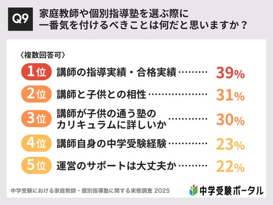 家庭教師や個別指導塾を選ぶ際の注意点を尋ねると、「講師の指導実績・合格実績」39%、「講師と子供との相性」31%、「講師が子供の通う塾のカリキュラムに詳しいか」30%と講師に関する条件が上位を占めました。