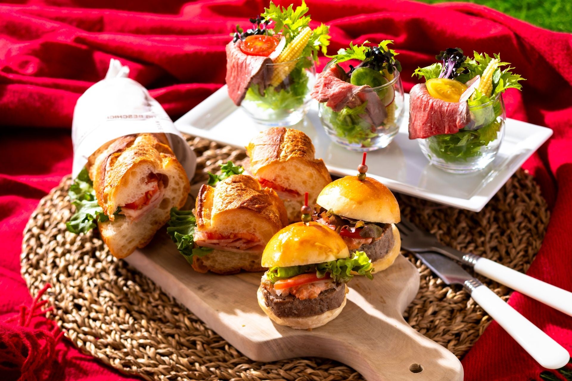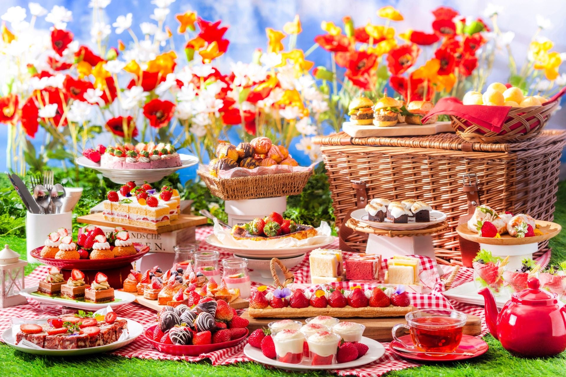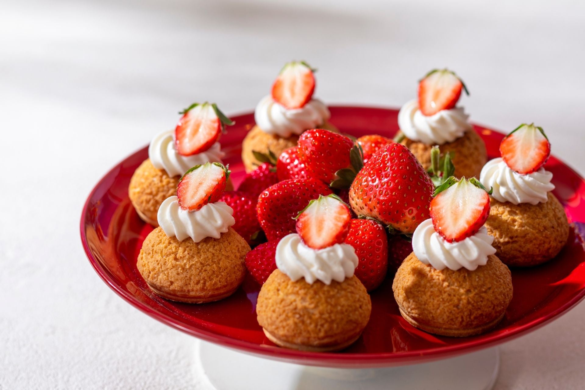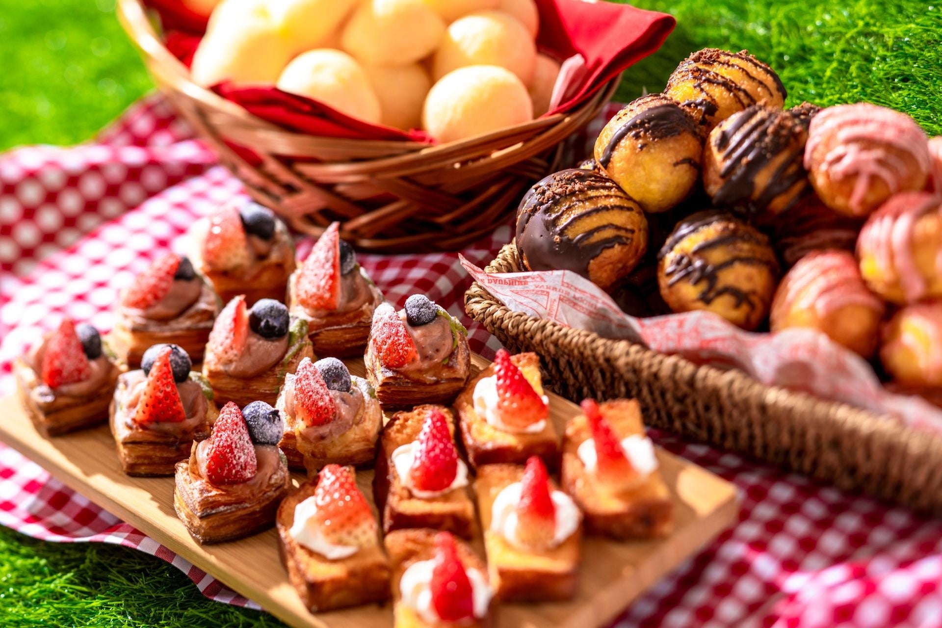 お口直しのセイボリーには、ミニバーガーやカスクート、厚焼き玉子を挟んだサンドイッチなど、ピクニックをイメージしたメニューがラインナップ。さらに今回は、いちごをのせたデニッシュやハニートースト、話題の生ドーナツなどホテルブーランジェ特製のパンも一口サイズでご用意。例年人気の”国産いちご3種類食べ放題”も実施します。