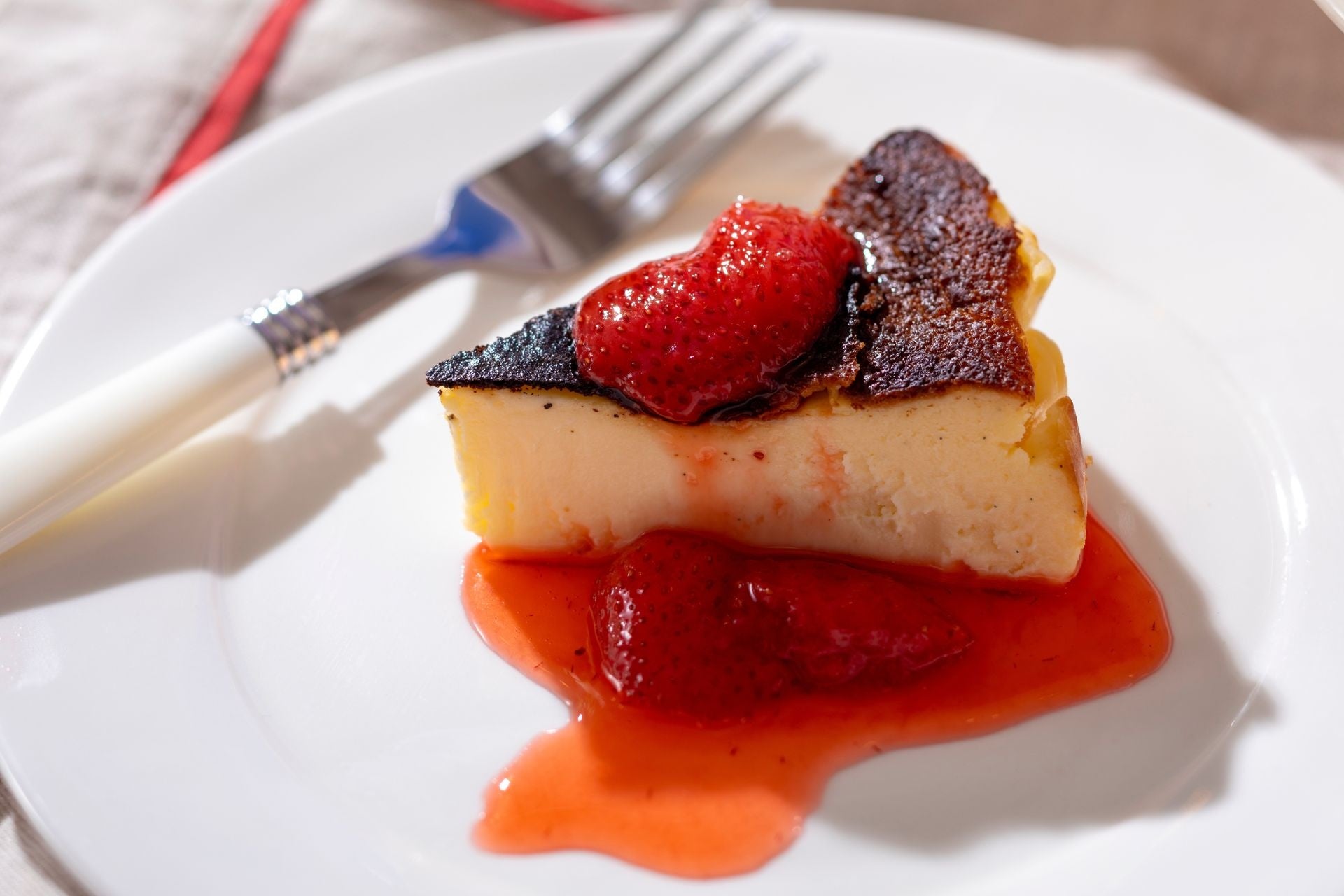 ホテルスタッフの中にもファンが多いバスクチーズケーキは、ポートピアホテルのシェフパティシエ 芳養の一押しメニュー。ミルキー感が強いスペイン産クリームチーズを使用し、香ばしさと優しいコクが調和するまろやかな味わいに仕上げました。甘酸っぱいいちごのコンフィチュールを掛けてお召し上がりください。