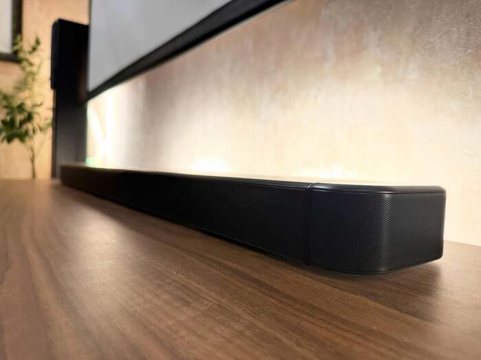そこには、木調のダークブラウンの台に置かれた黒のサウンドバーが。