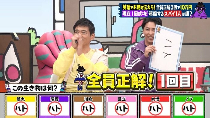横山さんが「バード」「ピース」「ジャパンバード」「ジャングル」という単語で伝達すると、みなピンと来た表情を見せて「ハト」と解答。