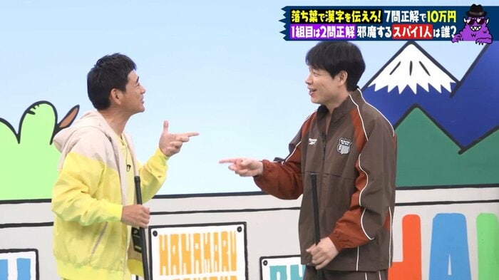 最初は順調に正解が続くも、華丸さん&川島さんがほうき係になると、互いに相手が作ったものを崩し合って、漢字が定まらず。「衣」がうまく書けずに伝達失敗。