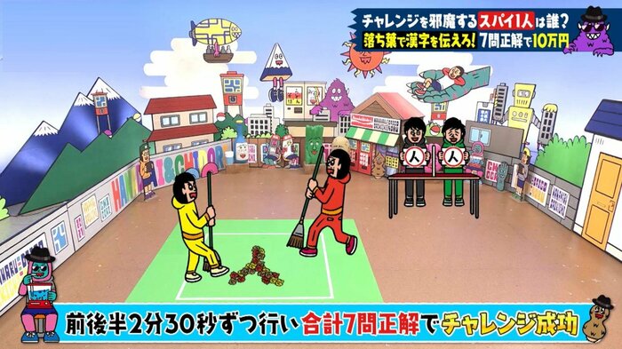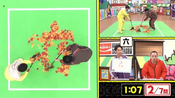 2人が協力して落ち葉をほうきで整えて、お題の漢字1文字の形を作って伝達。解答者2人が正解で1ポイント獲得。前半・後半で合計7ポイント獲得で成功です。