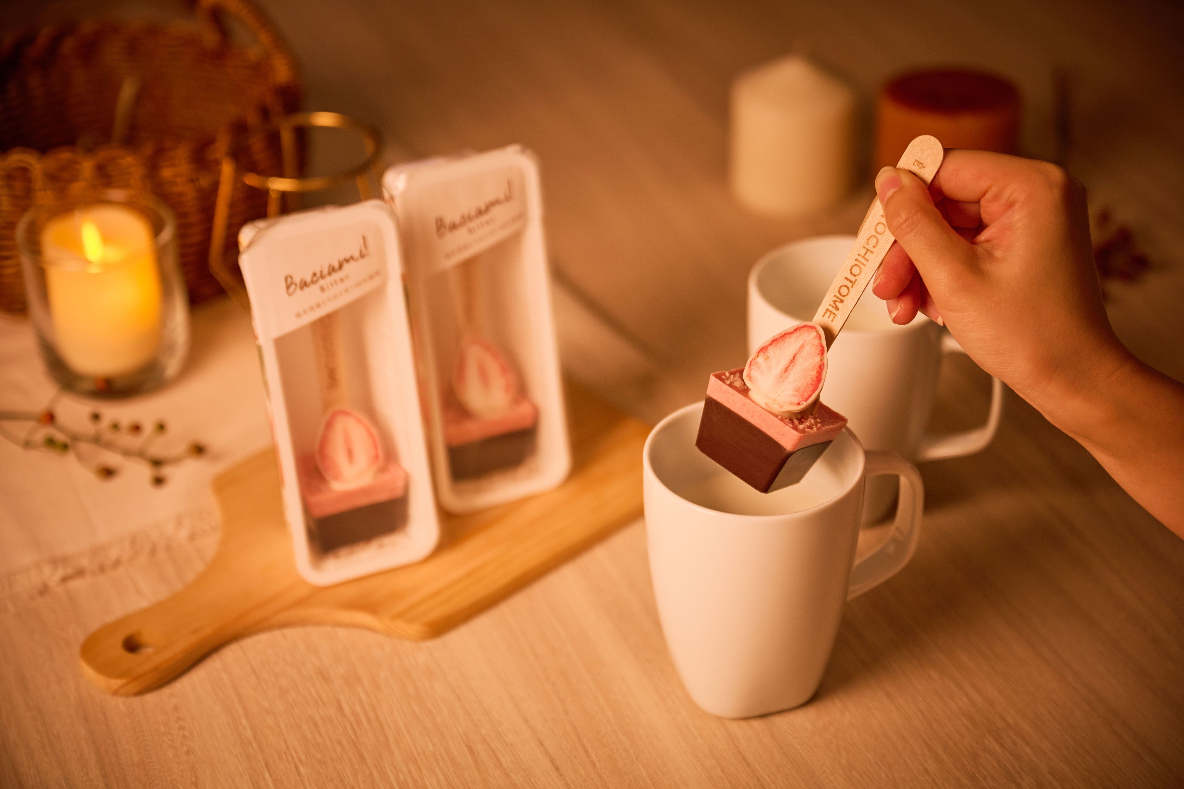 「バーチャミ」は、ホットミルクに溶かして楽しむチョコスプーン。栃木県産とちおとめをフリーズドライでトッピングし、苺の香りと甘みが広がる贅沢な一品。那須名産の牛乳とともにお召し上がりください。
