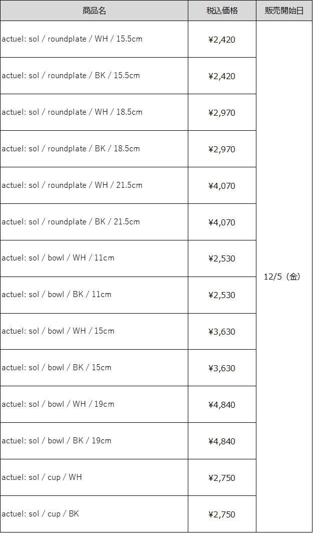 IDEEを展開する株式会社良品計画(東京都文京区/代表取締役社長 清水 智)は、イデーのオリジナルテーブルウェアシリーズ「actuel: sol(アクテュエル ソル)」を、12月5日(金)よりイデーショップ全店とイデーショップ オンラインにて発売します。actuelはフランス語で「現代の」「今日の」、solは「土」の意を表します。柔らかな白と深みのある黒が、和の素朴な趣をまとう食器です。シンプルでありながらもエレガンスが漂うフォルムと、揺らぎのある色をストイックに追い求めた和食器です。