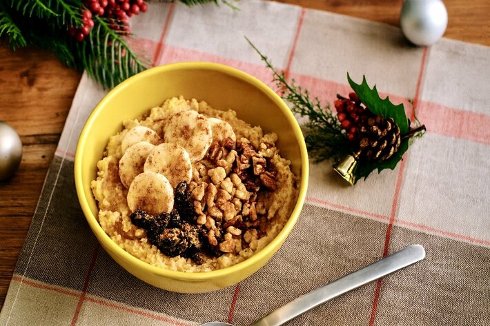 北米でクリスマスの定番として親しまれる「エッグノッグ」を、F&Pスムージーカフェでは有機アガ ベシロップとデーツの自然な甘みでヘルシーにアレンジ。濃厚なカスタード風の甘さと、ふんわり広が るスパイスが特徴です。このエッグノッグをオートミールと組み合わせた“エッグノッグ × オートミールボウル”は国内でも 珍しく、冬限定の“ご褒美ボウル”です。
