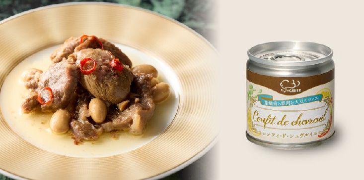 柑橘の爽やかな香りと山椒のスパイス感。大豆の食感が奥行きを添え、オイルと鹿肉が引き立て合う贅沢な一缶。長野県産の鹿肉を米油とともにコンフィに仕立て、「山のお肉」であるジビエに「畑のお肉」である大豆を合わせました。たんぱく質をはじめ栄養にも優れた一品です。そのままワインのお供としてはもちろん、好みの調味料でアレンジしたり、パスタソースに仕立てたりと、料理の幅を豊かに広げてくれます。