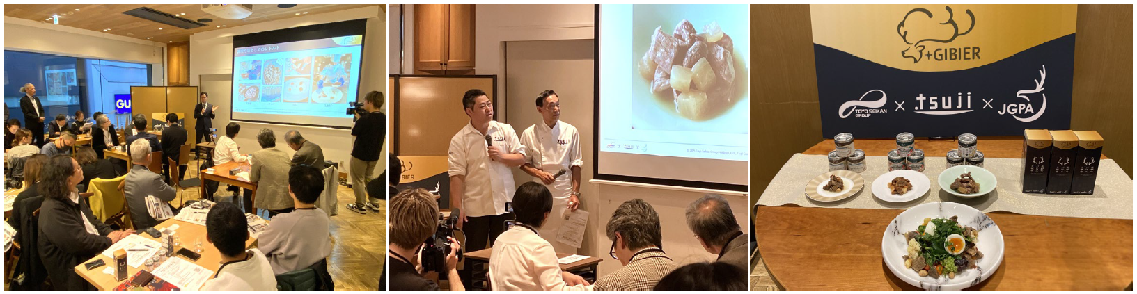 食のプロを育成する教育機関、辻調理師専門学校(本部:大阪市、理事長:辻芳樹)は、総合包装容器メーカーの東洋製罐グループホールディングス株式会社(本社:東京都品川区、代表取締役社長:中村琢司、以下、東洋製罐グループ)と共同で、食を通じた社会課題解決を目指す「+Recipeプロジェクト(プラスレシピプロジェクト)」※ を2021年より推進しています。昨日はその第2弾となる「+GIBIERプロジェクト(プラスジビエプロジェクト)」の発表と、このプロジェクトから誕生した「長野のジビエ三種缶」の試食会を開催しました。また「長野のジビエ三種缶」については、より多くの方に手軽にジビエ料理を楽しんでいただきたく、応援購入サービス「Makuake」にて販売を開始いたしました。