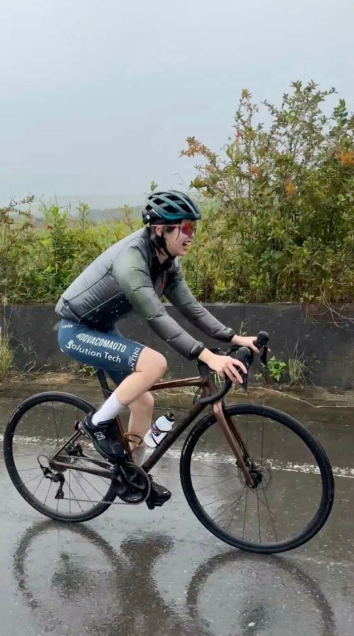 しかし、アイドルの姿とはガラリと変わり、本格的なサイクルウェアに身を包んだ荒野さんは、大雨なんかお構いなしに「雨だーー笑 あともうちょっと!」と笑顔で爆走する姿を見せました。