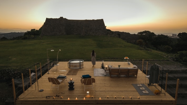 1|世界遺産・中城城跡の営業時間外貸切体験通常立ち入ることができない静寂と絶景を独占できる環境を、仮設設備のみで構成された期間限定のポップアップリゾートとして構築。東西の海を望む高台という立地を生かし、時間帯による景観の変化と文化財環境での滞在価値を検証します。