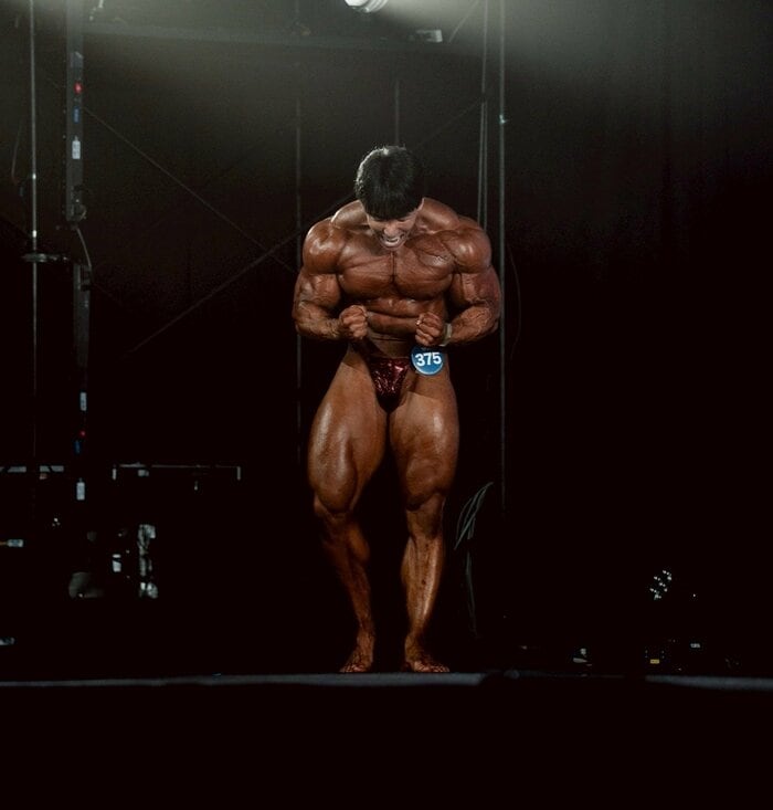 そこには、優勝が発表された瞬間でしょうか、ステージの袖でガッツポーズをする横川さんの姿が。ポーズを決めていないにもかかわらず、手から足までと、全身のムッキムキの筋肉たちが、横川さんの喜びに反応するかのように発達しています。