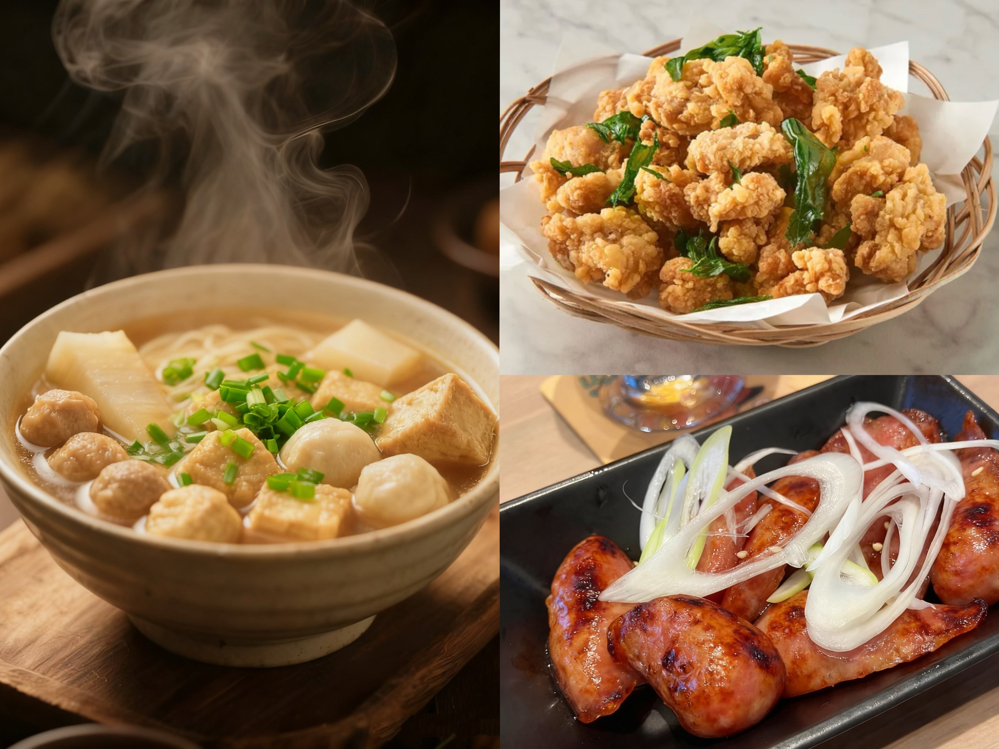 ・台湾おでん(関東煮):澄んだ甘めのスープに、柔らかく煮込んだ大根や、だしをたっぷり吸った厚揚げ、甘辛ソースつけ、これが夜市でいちばん心まで温まる味です。