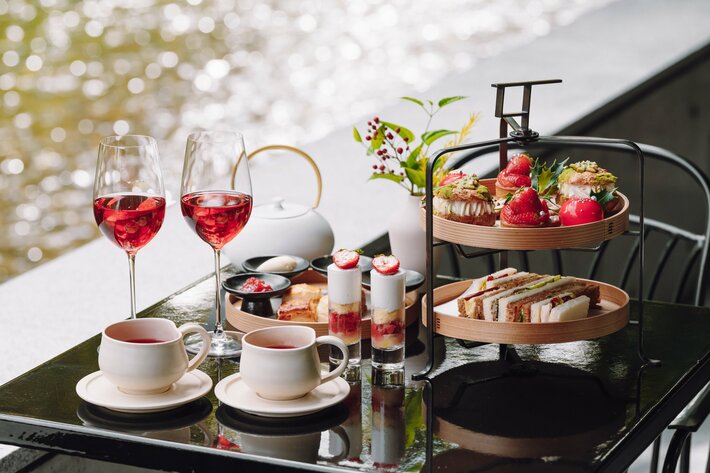 フェスティブシーズンを象徴する苺や旬の素材をふんだんに使用したペストリーとセイボリーが、テーブルに華やかな彩りを添えます。スコーンは、スパイスの香りがほのかに広がるバターミルクとミックスフルーツを練り込み、クロテッドクリームと季節のジャムが味わいを一層引き立てます。セイボリーには、チキンに小豆島オリーブとクランベリーを合わせた香り豊かな一品や、黒トリュフの芳香が広がるエッグマヨネーズ、スモークサーモンをケールペストで爽やかに仕上げたもの、さらにスイートポテトとスモークチーズの軽やかな温もりが感じられる組み合わせなど、多様な味わいが並びます。