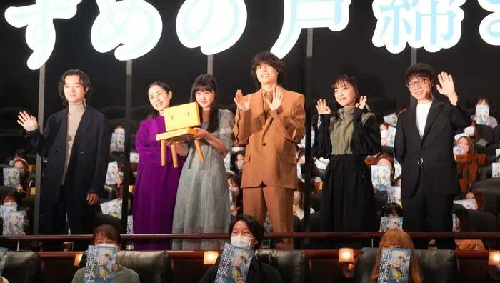 「すずめの戸締まり」の初日舞台挨拶が行われ、原菜乃華さん、松村北斗さん(SixTONES)、深津絵里さん、染谷将太さん、花瀬琴音さん、新海誠監督が登壇しました。
