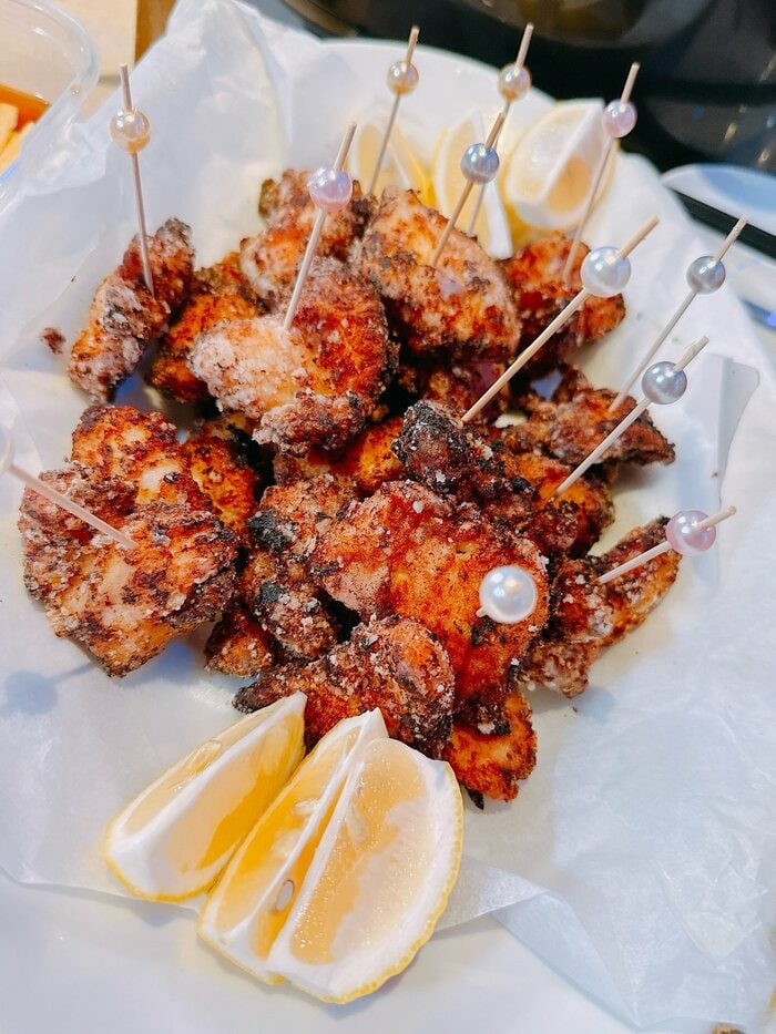 一口かじっただけでジューシーな肉汁が出てきそうな「唐揚げ」には、パールのようなアクセサリーが付いたピックが刺されています。カットレモンも用意され、さっぱりと味わえそうです。