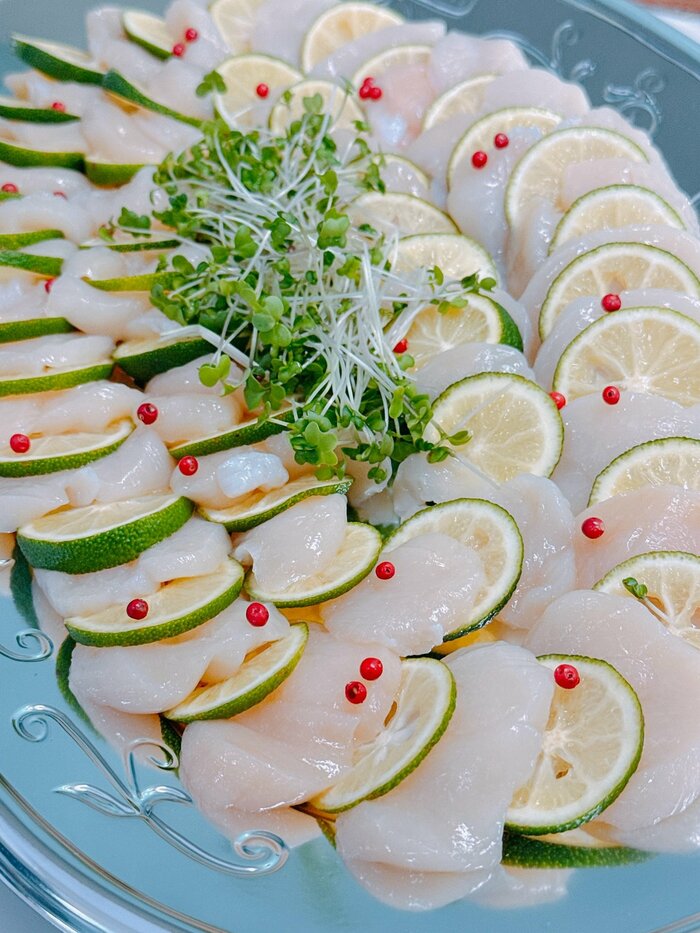 まずは、お皿にキレイに盛り付けられた「#ホタテのカルパッチョ」。