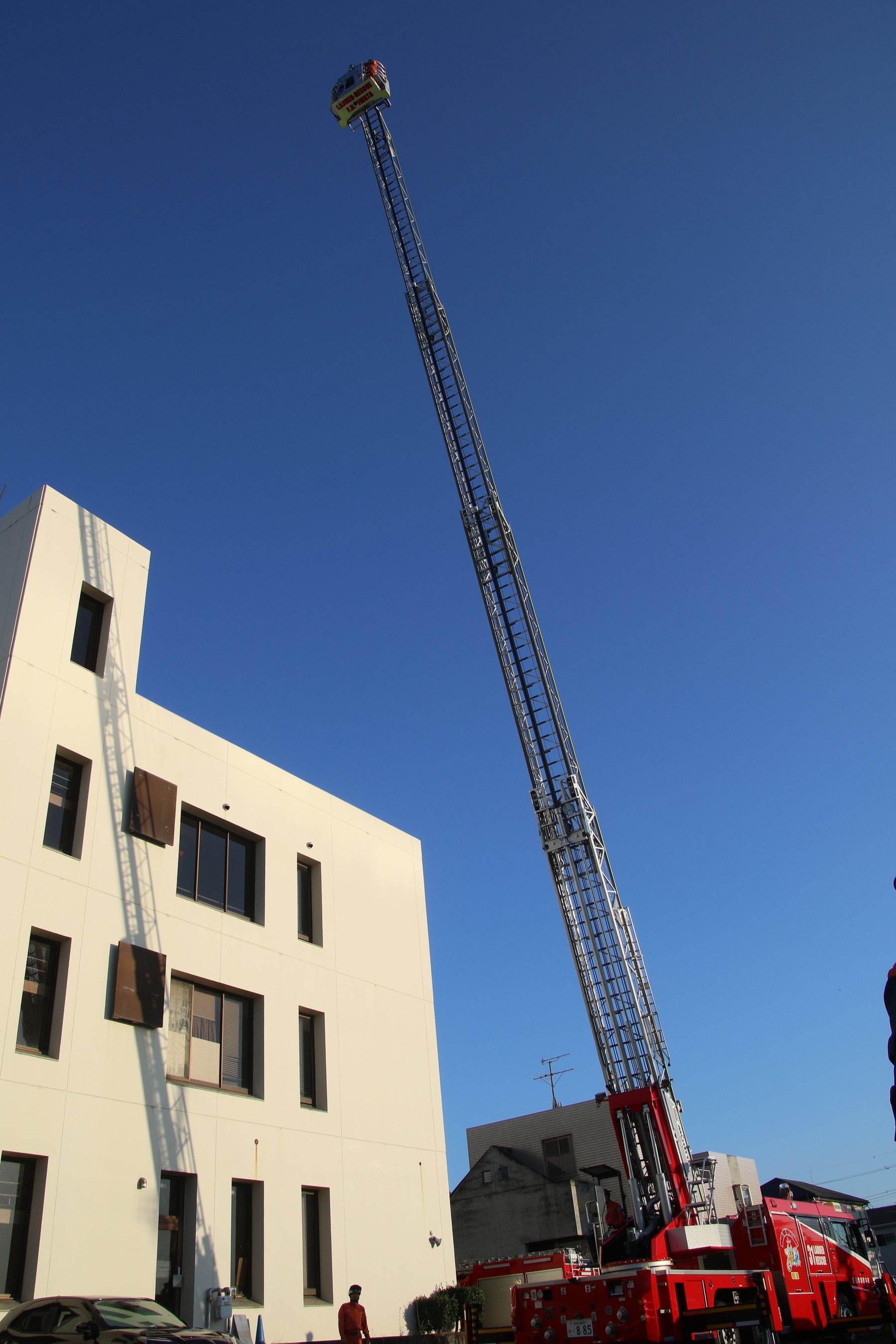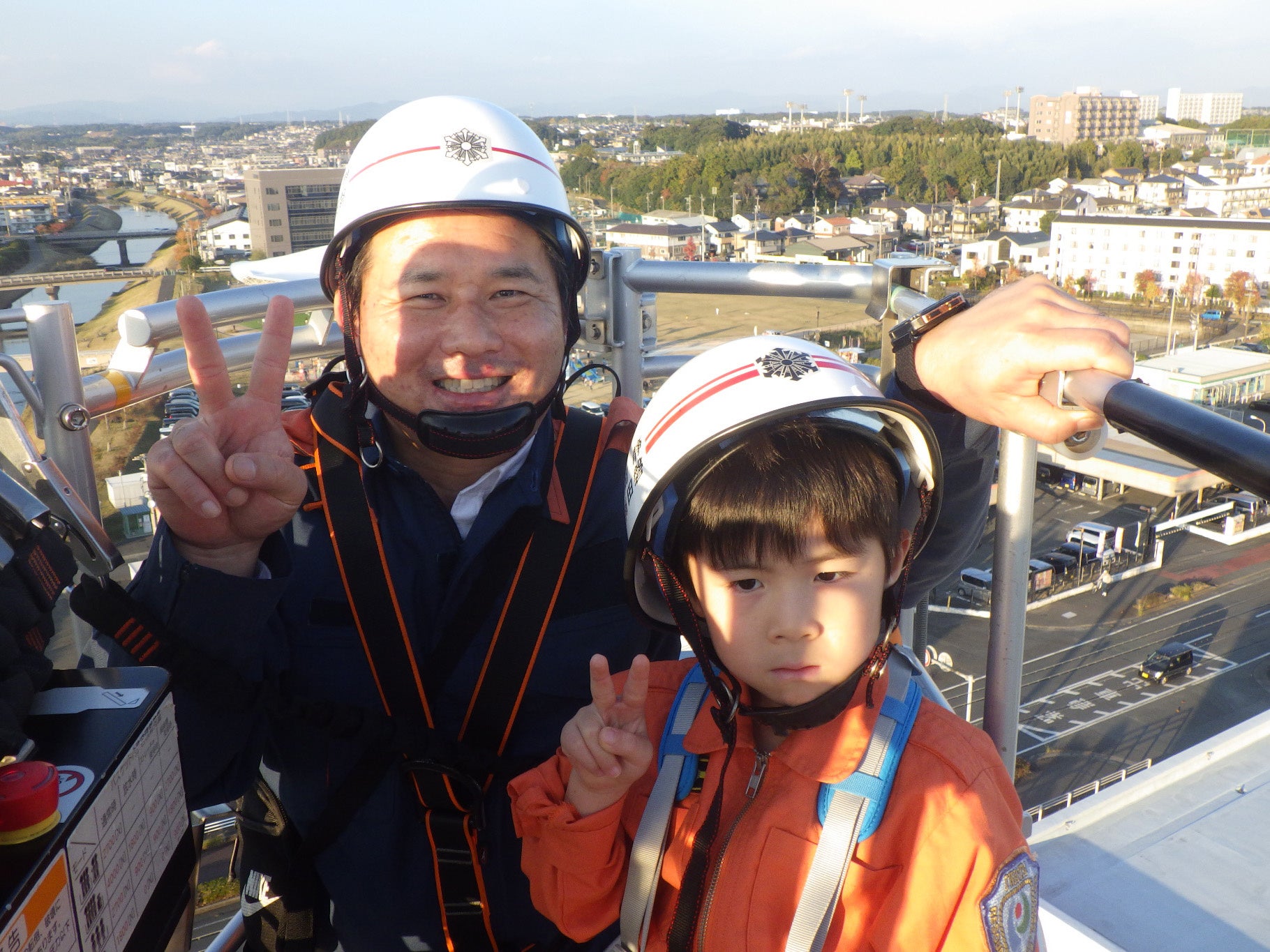 はしご車に搭乗し、30mの高さまで上昇しました。市内を一望でき、天気が良いと富士山を目にすることができる高さです。