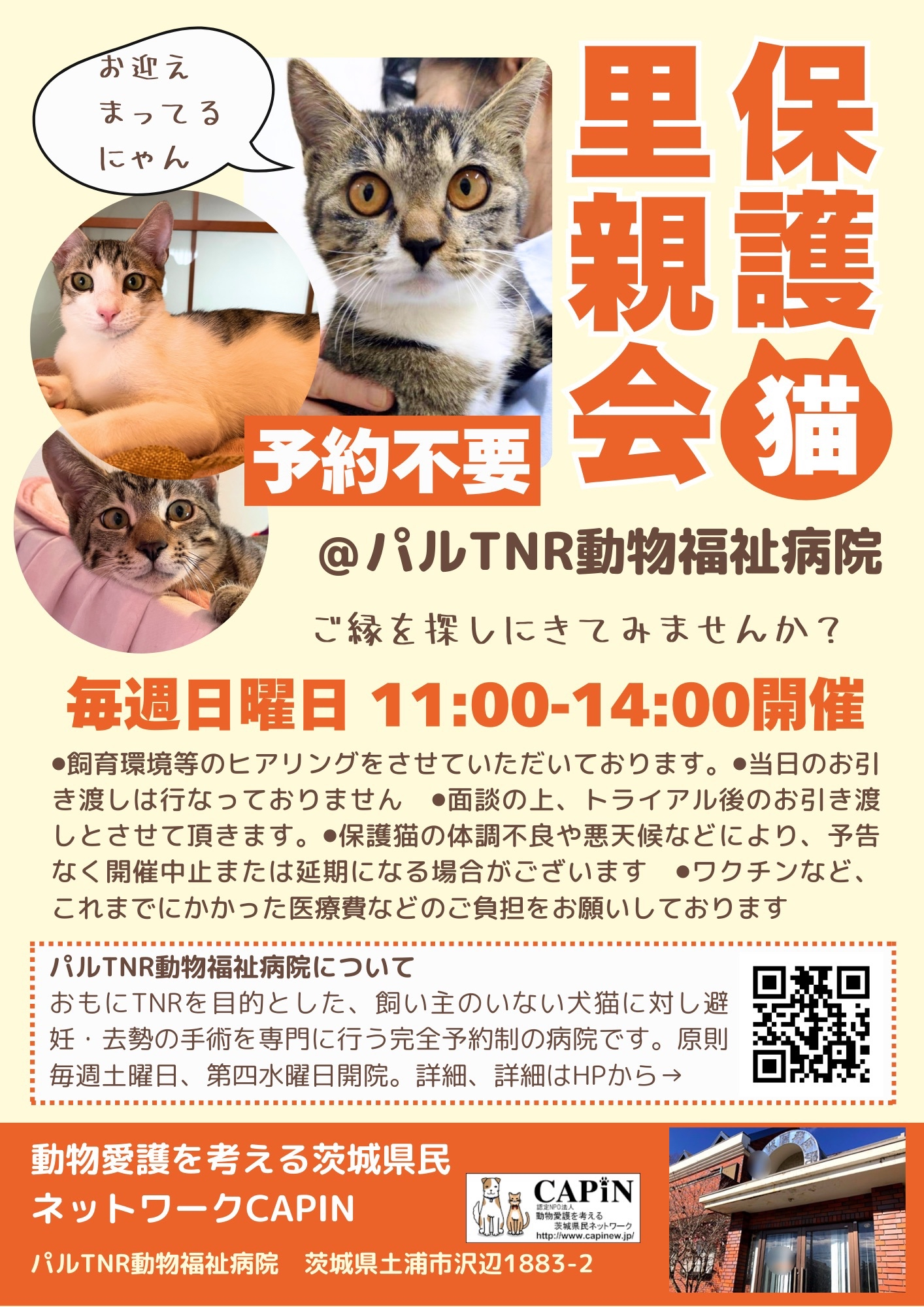 CAPINは、パルTNR動物福祉病院(茨城県)にて、毎週日曜日11:00~14:00に保護猫里親会を2025年11月よりスタートしました。予約不要でご参加いただけますので、新しい家族を探している猫たちに、ぜひ会いにきてください。