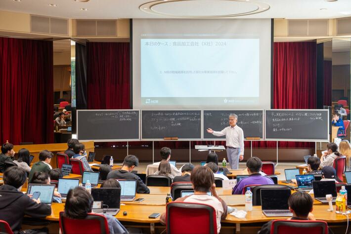 商学部3年生を対象に、自らビジネスプランを構想する授業「事業構想実践」が開講されました。この科目はインテンシブ教育プログラム(集中プログラム)の一つで、新規事業の創出に関わるケースを通して、起業家がどのように事業を実現し、関係者を巻き込みながらチームをつくり上げたのかを学びます。今回は「食品加工会社(X社)」を題材にディスカッションを行い、X社が抱える課題に対する新たな事業展開を検討しました。授業の最終日には、これまでの学びを生かしてチームごとにビジネスプランを発表するプチビジネスプランコンテストを実施しました。