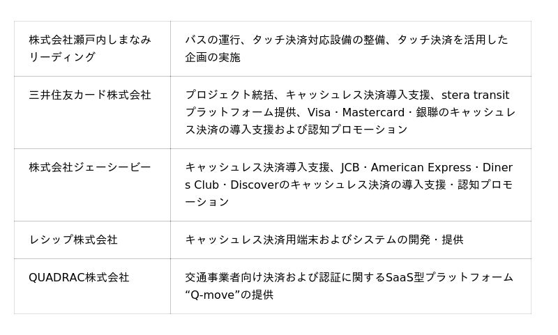 株式会社瀬戸内しまなみリーディング(本社:愛媛県今治市、代表取締役社長:宮本 敬治)、三井住友カード株式会社(本社:東京都江東区、代表取締役 社長執行役員 CEO:大西 幸彦、以下 三井住友カード)、株式会社ジェーシービー(本社:東京都港区、代表取締役会長兼執行役員社長:二重 孝好)、レシップ株式会社(本社:岐阜県本巣市、代表取締役社長:北野 元昭)、QUADRAC株式会社(本社:東京都中央区、代表取締役社長:高田 昌幸)は、2026年2月5日(木)に、しまなみバス3路線で三井住友カードの公共交通機関向けソリューション「stera transit」を活用したクレジットカードなど(※)のタッチ決済サービスを開始します。