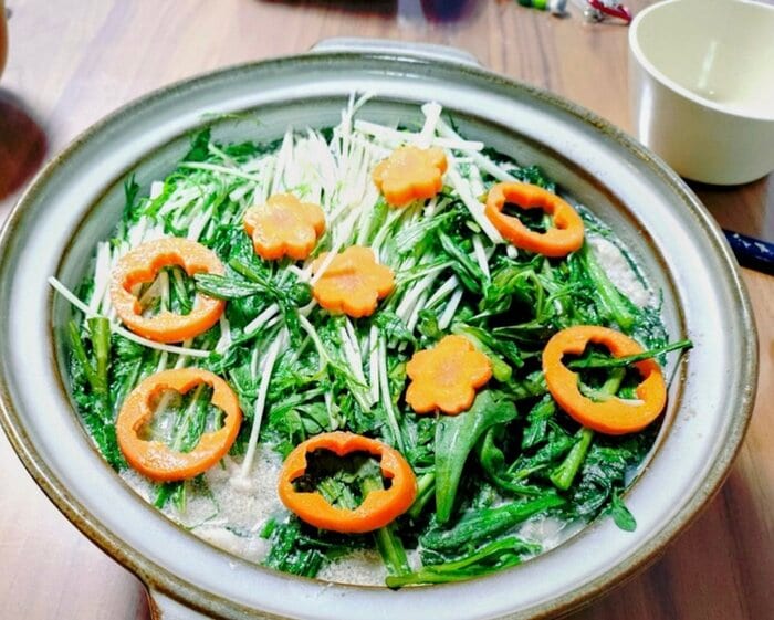 下にうどんが入っているのでしょうか…鍋を覆い尽くすほどの緑の野菜たちでその姿が見えません。その上には桜の花びら型にくり抜いたにんじんが可愛らしく散りばめられています。