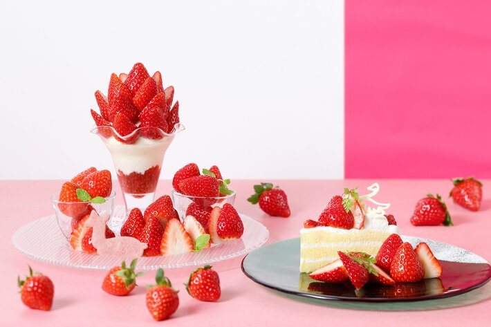 今回のフェアでも土耕栽培と有機肥料にこだわる奈良県天理市の“中井農園”で収穫されたいちごのみを使用。奈良県オリジナル3品種「古都華」「ならあかり」「アスカルビー」を使い、シンプルな「古都華パフェ」、いちごを20個以上使った「古都華パフェ いちごDX」、さらにいちごを増量した「古都華パフェ スーパーDX」、そして今年は古都華を使用した「ショートケーキ」をご用意します。産地ならではの鮮度の高さと艶やかな一粒一粒をお楽しみください。