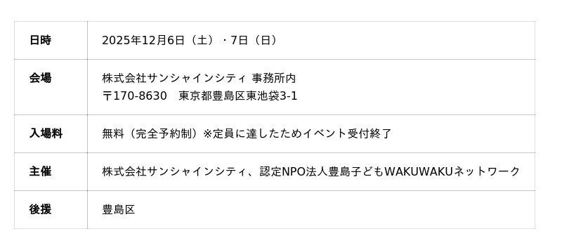 「子ども服マーケットin Sunshine City」は、地域のNPOや企業、区民、大学が連携し、寄付で集まった子ども服を地域の子どもたちにお渡しするほか、大人との交流や楽しい体験を提供するイベントです。