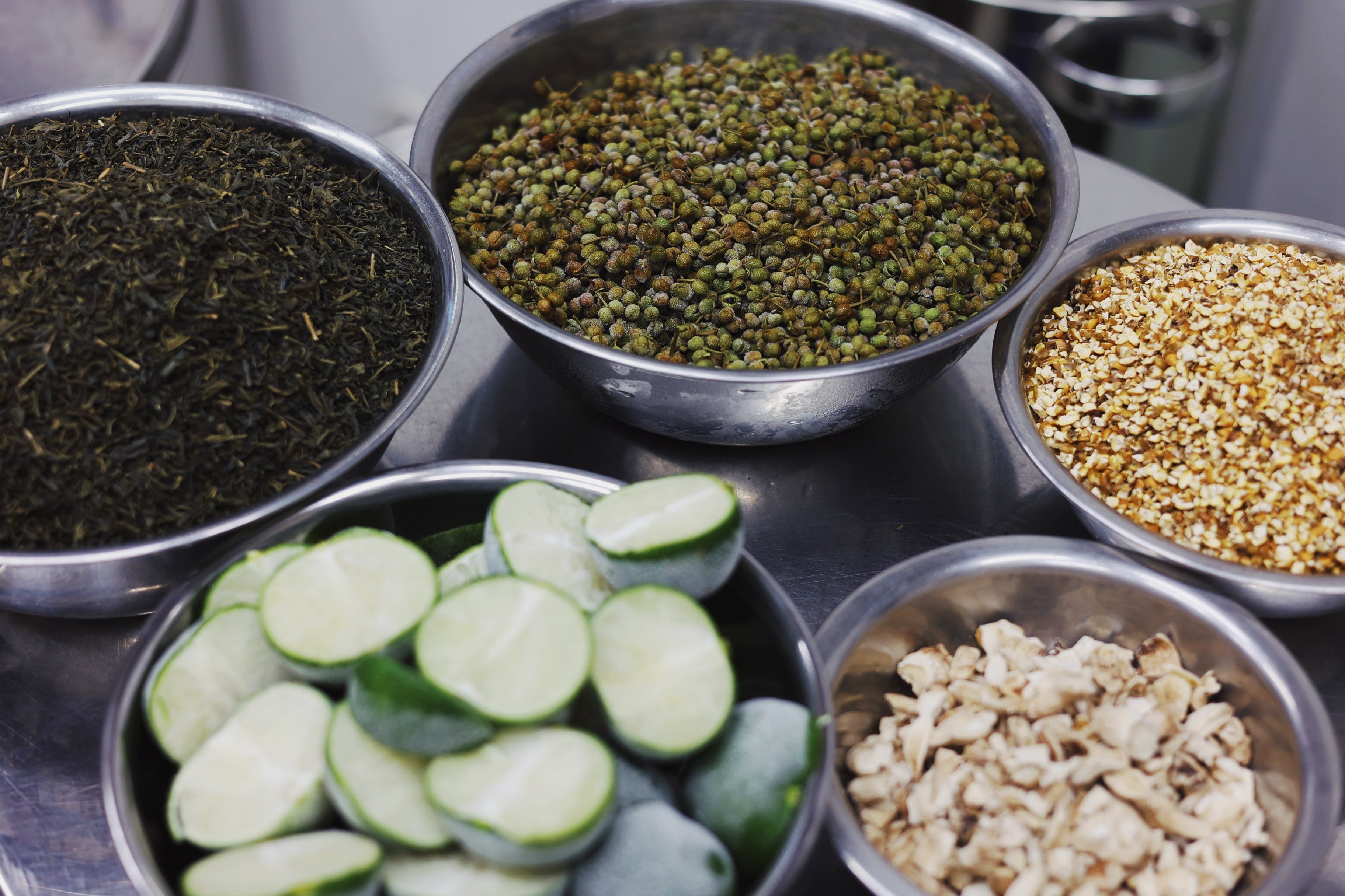 「Spirits of Terroir -高千穂郷・奥阿蘇 山椒-」に使用している素材(山椒・へべす・釜炒り茶・椎茸の軸・とうきび茶)