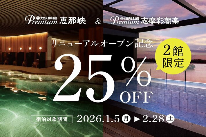 全国に72の温泉ホテル・宿やテーマパークを展開するGENSEN HOLDINGS株式会社(本社:東京都中央区、代表取締役:川崎俊介)が運営する大江戸温泉物語グループの「大江戸温泉物語Premium 恵那峡(以下、Premium 恵那峡)」「大江戸温泉物語Premium 志摩彩朝楽(以下、Premium 志摩彩朝楽)」の2館限定で、2026年1月5日より「リニューアルオープン記念25%OFFキャンペーン」を実施いたします。