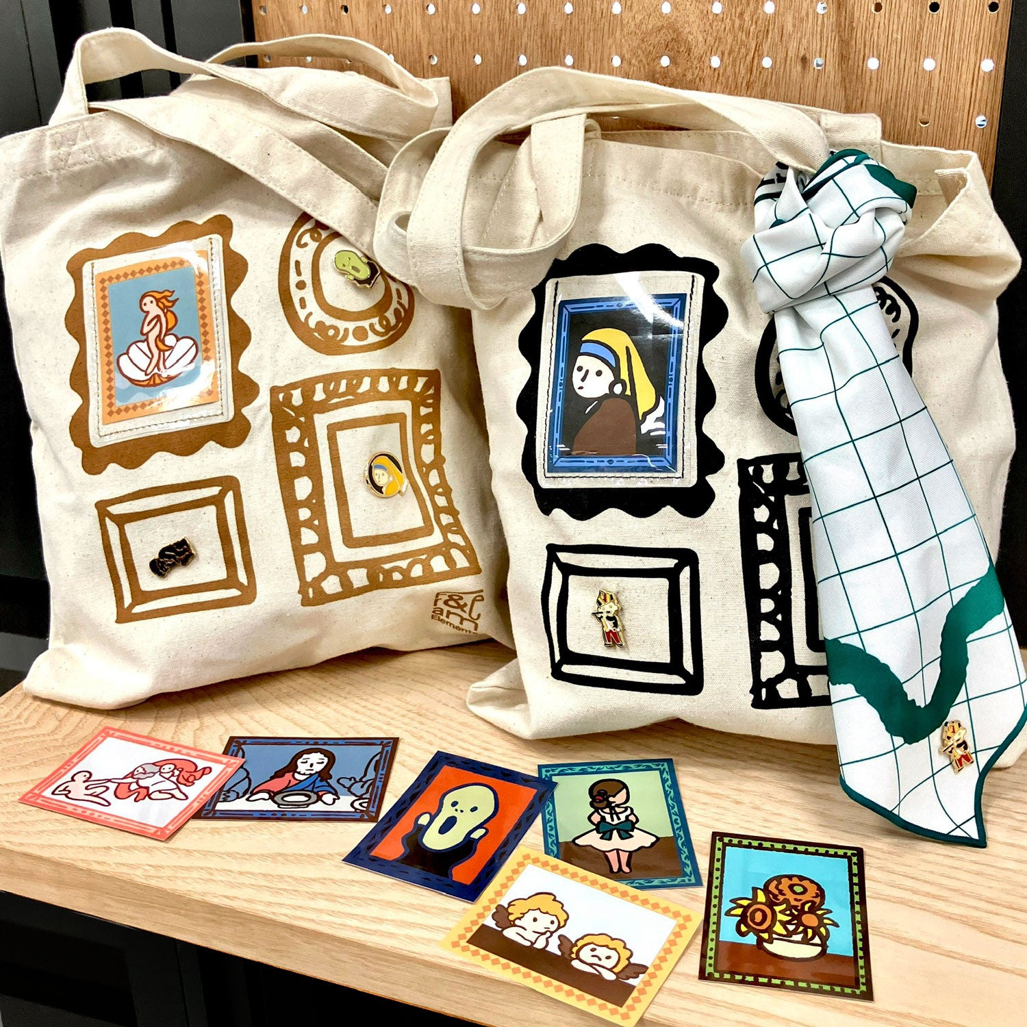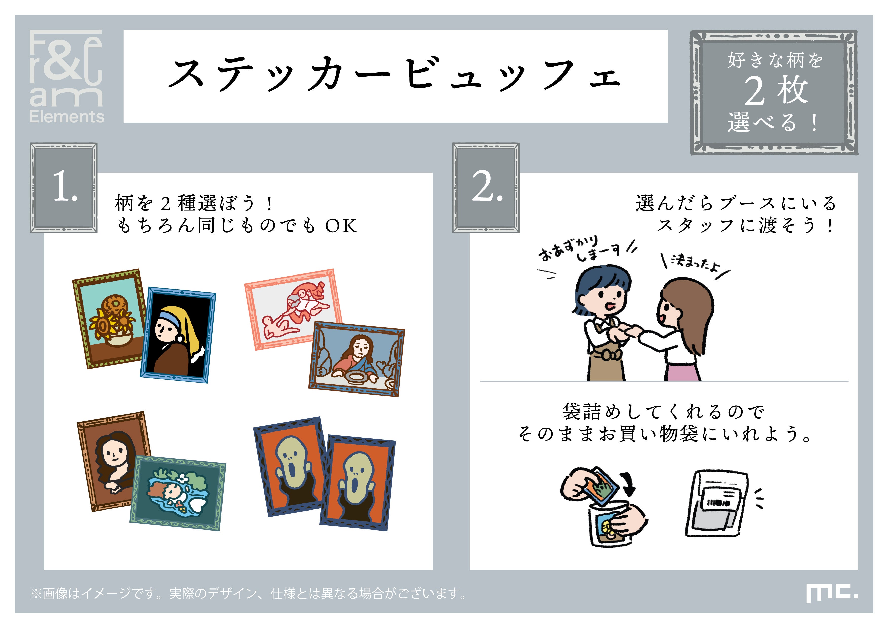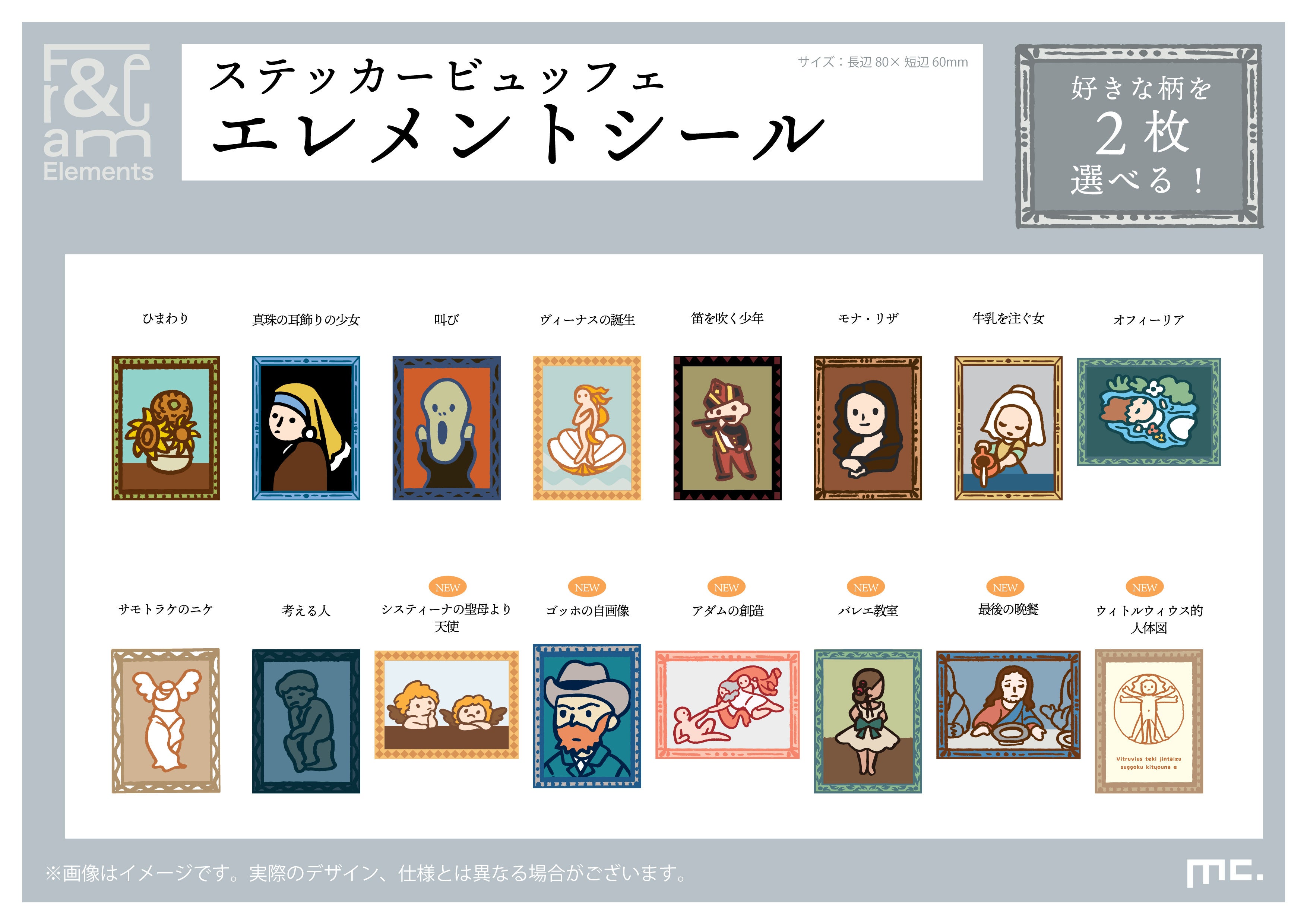 毎回売り切れが発生する人気のアイテム!名画のイラストを使用した、全16種類のステッカーです。フレームトートバッグの窓に入れたり、ノートやスマホに貼るなど楽しみ方色々。お好きな2枚を選んでお買い求めいただけます。