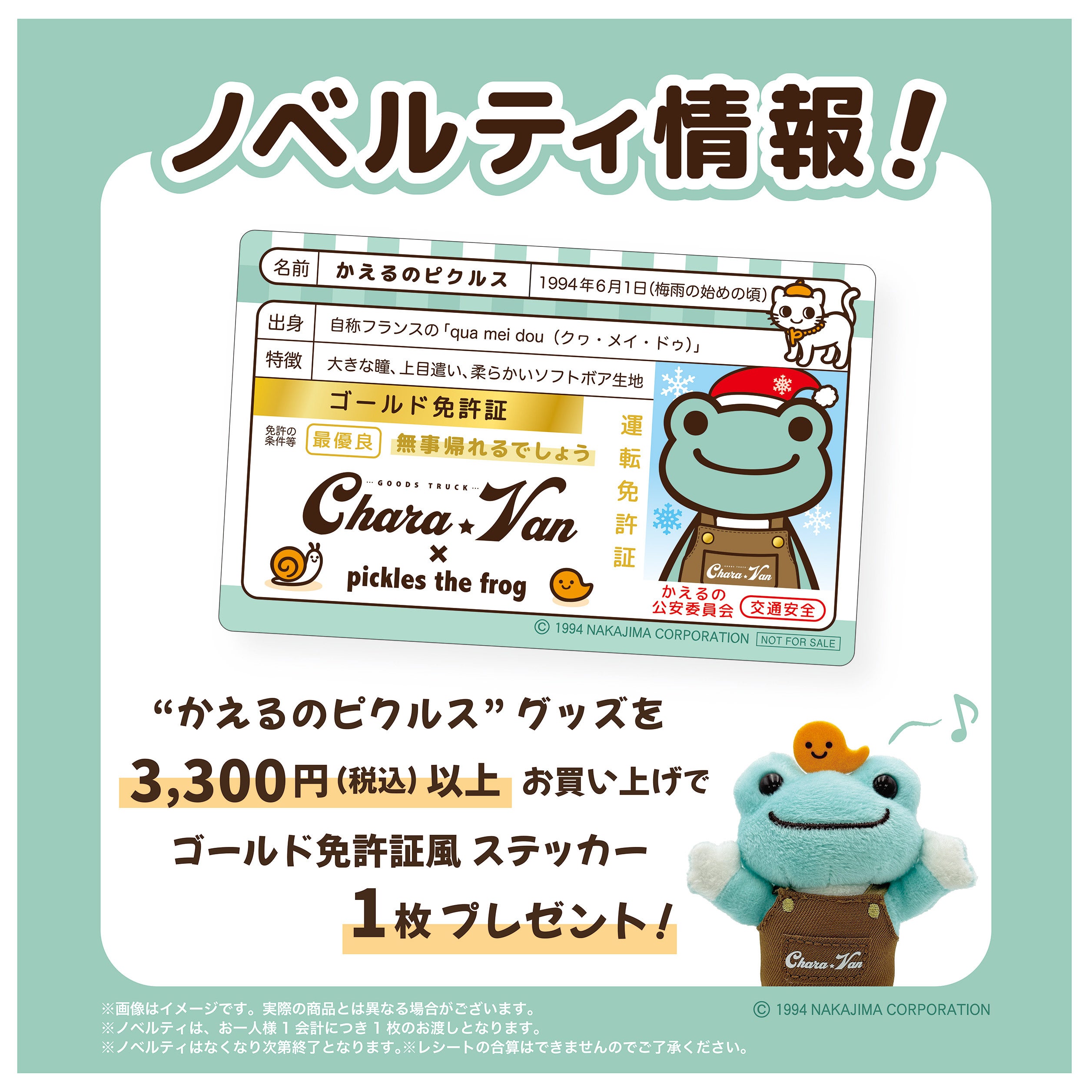 ”かえるのピクルス”グッズを3,300円以上お買い上げで「ゴールド免許証風ステッカー」を1枚プレゼント!