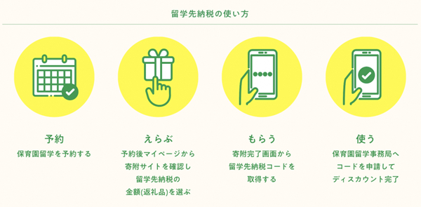 「留学先納税(R)」は、ふるさと納税制度を活用し、本市に寄附をすると、返礼品としてオンラインコード「留学先納税コード」を受け取り、「保育園留学」の費用の一部に充当できる仕組みです。米沢市の「保育園留学」に興味のある方は、ぜひ「留学先納税(R)」もご検討ください。「留学先納税(R)」の詳細:https://hoikuen-ryugaku.com/ryugakusakinouzei