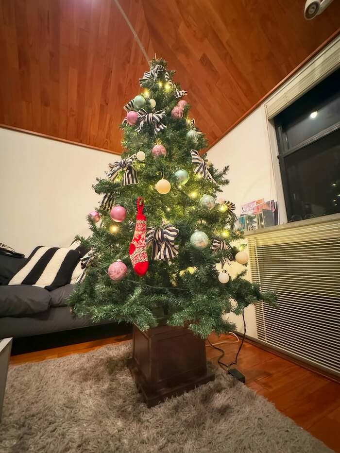 ツリーには、ピンク、緑、白など色とりどりの丸いボールや、ストライプ柄のリボン、トナカイが描かれた赤いノルディックソックスなど、オーナメントもとっても豪華!