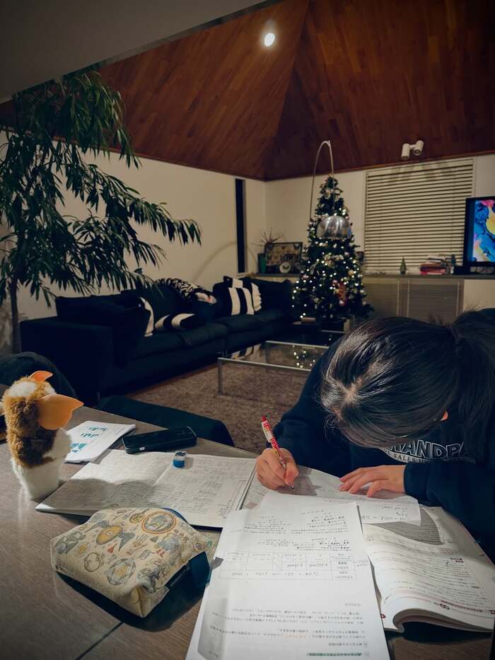 そんな、クリスマスムードあふれる自宅には、勉強を頑張る三女の姿も。