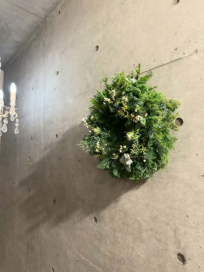 さらに、奥にシャンデリアの照明がともる白いコンクリートの壁には、リースも!